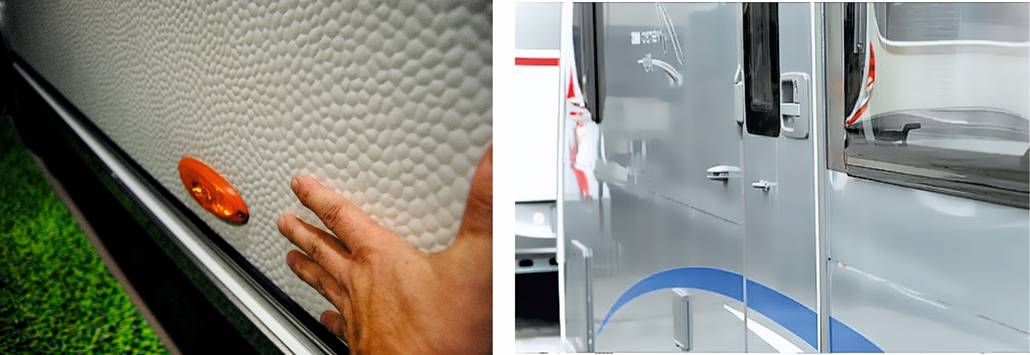 Караван со стенами из гладкого алюминия часто стоит немного дороже, чем такой же, построенный из сэндвич-панелей с теснённым алюминием. Чтобы предотвратить гофрирование алюминиевого гладкого листа, его толщина составляет уже около 0,8 мм. В результате фургон, изготовленный из гладкого листового металла с длиной кузова 6 метров, примерно на 20 килограммов тяжелее, чем такой же жилой прицеп из теснённого металла. Стены такого каравана также чувствительны к внешним механическим воздействиям, но отремонтировать его легче. Для этого применяются те же самые материалы, что и при ремонте кузова автомобиля.