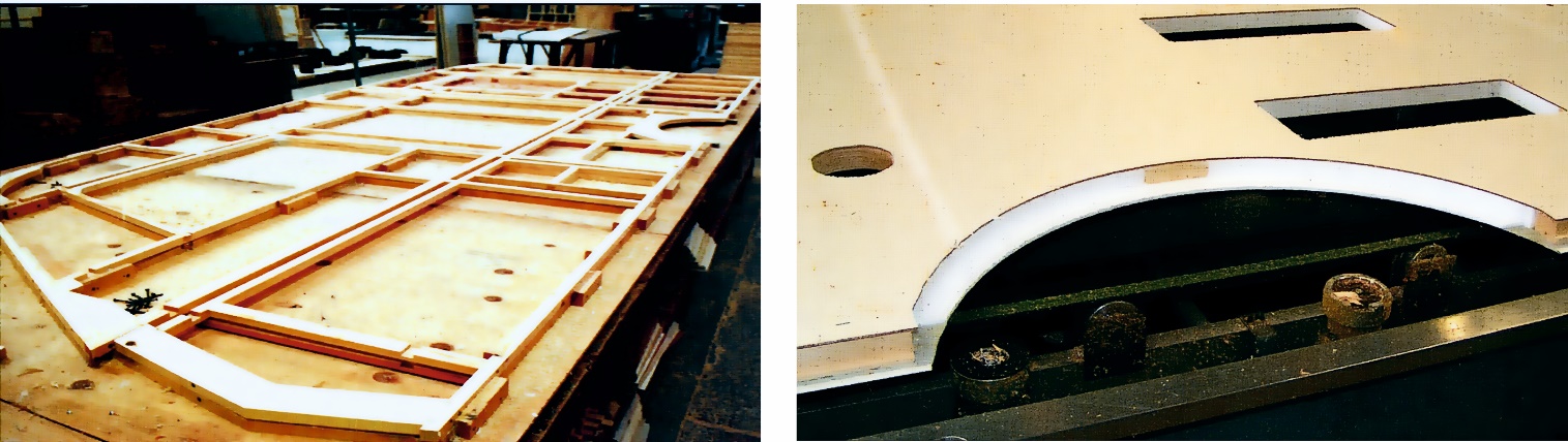 Рисунок 3.2. Слева – деревянные закладные. Справа – готовая сэндвич-панель с вырезанными техническими отверстиями.