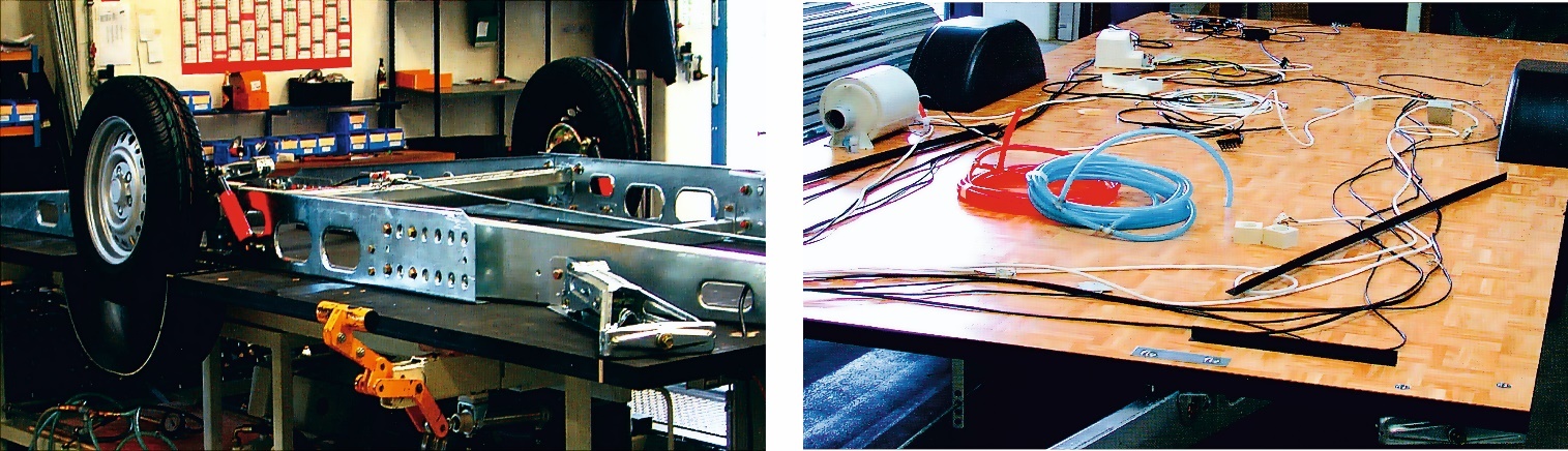 Рисунок 3.3. Этапы производства. Слева – установленное одноосное шасси. Справа –перевернутый прицеп и разметка оборудования.