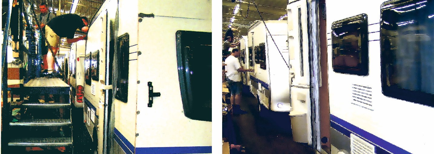 Рисунок 3.7. Слева – почти готовый караван для монтажа крыши. Справа – установка крыши на большой жилой прицеп «Adria».