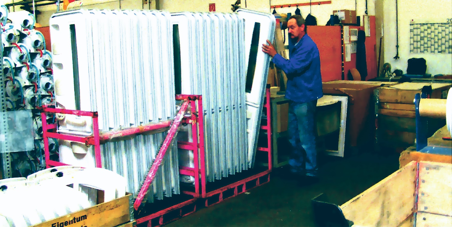 Другим популярным материалом в караваностроении является стеклопластик, которые производятся по другой технологии. Сначала изготавливают пресс-форму. Она является самой дорогой деталью в процессе производства. Её себестоимость напрямую будет влиять на окончательную цену изделия. Далее, на готовую пресс-форму наносят слой геликоида. Это особый материал в виде геля, который используется для защитно-декоративного покрытия будущего изделия. После высыхания он предает наружному слою детали гладкость и глянец. Затем наклеивают несколько слоев стекловолокна. После того, как набрана нужная толщина, деталь высушивается и снимается матрицы. Этот материал имеет высокую ремонтопригодность: то есть в случае повреждения, стеклопластик, без особых проблем, восстанавливается обычными технологиями, которые используют при ремонте кузова автомобиля. Именно поэтому, из стеклопластика удобно делать небольшие детали, но прочные детали. В конечном итоге, себестоимость одной детали выше, чем производство аналогичной из ABS – пластика.