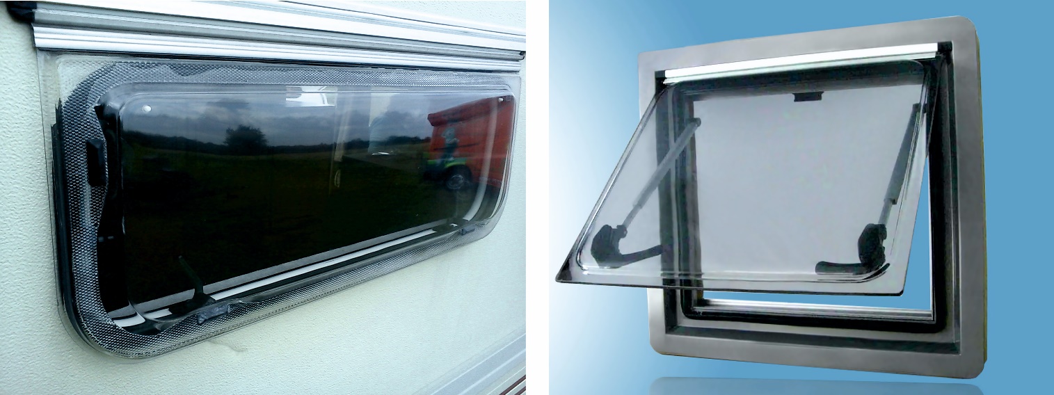 На более дорогие модели техники для караванинга устанавливают акриловые окна с пластмассовыми рамами. Конструктивно они представляют собой две рамки: наружная, куда вставляется акриловый стеклопакет и внутренняя, с москитной сеткой, ролл-ставней или жалюзи. При закрытом окошке, обе эти рамки плотно прилегают друг к другу, обеспечивая хорошую герметичность при любой погоде. Основной плюс рамных окон – хорошая теплоизоляция и быстрая, удобная установка. Минус – это более дорогая конструкция, в сравнении с безрамным стеклопакетом. Кроме того, рамные окна очень требовательны к толщине сэндвич – панели. В среднем они рассчитаны на толщину стены от 25 до 50 мм. А вот безрамное окно можно установить на стену любой толщины.