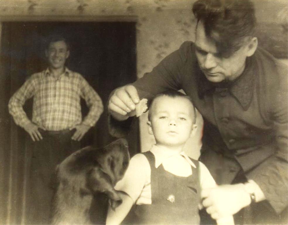 Дрессировка старины Рекса. Отец, дядя Пётр Алексеевич и я в 4-летнем возрасте. Калининград, 1949 год