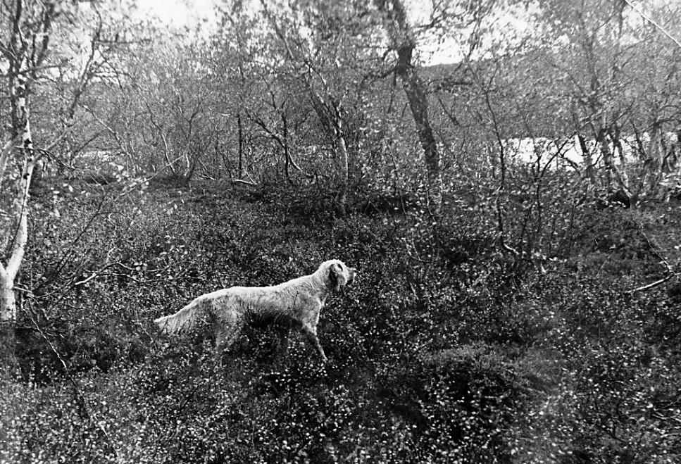 Дальше идём вдоль ручья, медленно поднимаясь вверх между плосковатыми сопками. Распадок выводит нас к двум малюсеньким озерцам. Минуем их, стараясь идти по левому, более сухому берегу. Метров через триста собака забегает в густые заросли, и тут же от неё во все стороны начинают вылетать куропатки. Птиц около десятка. Вот одна на небольшой высоте облетает меня справа над озерцом. Коротко поведя, стреляю. Куропатка тряпочкой валится в береговые кусты. «Хороший выстрел», – отмечаю я мысленно. Ещё через десять минут Вега тянет к кустам на самом берегу озерца и чётко застывает на стойке. Светлая собака на фоне тёмных кустов и буро-зелёных листьев черники… очень эффектно! Успеваю достать фотоаппарат и сделать снимок. Потом посылаю Вегу вперёд. С характерным криком взлетает молодой куропач и тут же падает в черничные кустики.