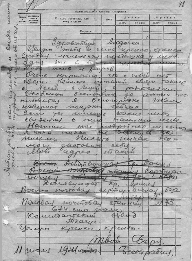 На тот же завод получили назначение однокурсники и друзья родителей, супруги Нина Михайловна Егорова и муж Яков Исакович Байтман, выходец из семьи одесской еврейской бедноты, яркий игрок институтской сборной по футболу.28 октября 1940 года мама осталась в Ассиновской одна. Сунженский РВК призвал отца на действительную военную службу рядовым 674 стрелкового полка 150-й стрелковой дивизии. Офицерского звания отец, как и другие однокурсники, не имел, хотя проходил военную подготовку в институте и был «Ворошиловским стрелком». Это подтверждают фотографии с пояснительными надписями и соответствующий значок. Перед началом войны 674 СП дислоцировался в Одессе. В письме маме 15 июня 1941 года, отец интересовался, призвали ли в армию Яшу Байтмана, упомянул, что накануне сфотографировался, и фотограф потратил много времени, добиваясь веселой улыбки. Обещал выслать фотографию 28 июня. Не получилось. Уже 23 июня 1941 года 674 полк вел бои у пограничной реки Прут в Молдавии. Последнее письмо с датой 11 июля 1941 года, было из действующей армии. Отец сообщал, что пишет во время передышки после трехдневных боев в Бессарабии, что потерял связь с сестрами Лесей и Лизой и волнуется за судьбу родителей, жителей местечка Белогородка Изяславского района Каменец-Подольской, ныне Хмельницкой, области. Сообщил адрес: Действующая Кр. Армия, военно-почтовая сортировочная база «Т», полевая почтовая станция № 73, 674 стр. полк. Комендантский взвод. Больше писем не было. За время Войны 150 стрелковая, пережила второе и третье формирования, заслужила орден Кутузова II степени и почетное наименование Идрицкая. Бойцы дивизии – по официальной версии Егоров и Кантария, водрузили над Рейхстагом Знамя Победы. Дошел ли до Берлина кто-нибудь из бойцов 1-го формирования, не известно.