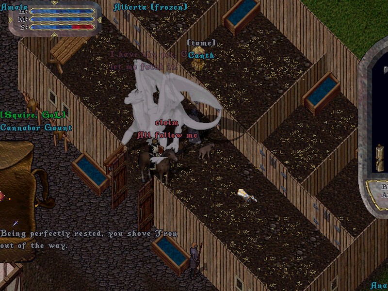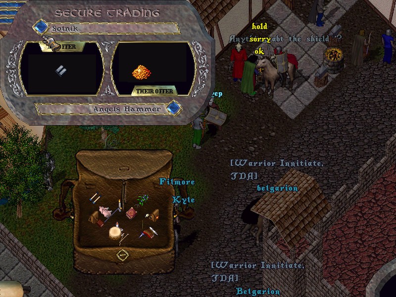 Like any social system, Ultima has its own ethics, which most players honor. So, if you become a witness to the player's fight with monsters, you do not need to rush to the rescue, most likely he can handle it without you. Another thing is when a player is trying to get away from some creature, and it does not work. In such a situation, you can first get involved in the course of events, and then ask if anyone will be against it. The fact is that for ridding the world of any monster characters get an increase in Fame and Karma. I, for example, was hurt when a couple of gawkers finished off the ettin I'd mauled. Only the blow that puts an end to the monster's life counts. And when I said what I thought of them, one of them threw back, "This is life".