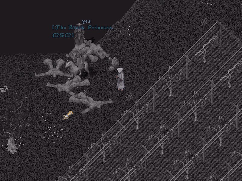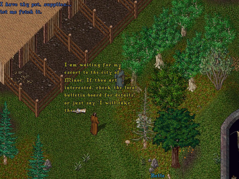 Here's an incident that happened to me shortly after I pumped up my skills slightly and decided to go outside the city – to chop wood and make bows for sale. I was walking through the woods, along the road that leads to Minoc – you can't chop wood quickly enough near the town, you need to go a bit farther away. My attention was caught by some well-equipped characters who were running toward the town. When they stopped, they told me not to go any farther – there were PKs out there, so I could get killed. Soon it became clear that there was only one PK, but there were quite a few of us, so I had the idea of attacking the villain with the whole gang and killing him. In the end a final "GO!" appeared on the screen, and we went east to establish justice and restore the self-respect of those chars.