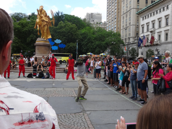 На северной оконечности парка группа афроамериканцев ради творчества и пожертвований зрителей устраивало шоу. Танцевали они с различными акробатическими этюдами довольно профессионально. Зрителей собрали много. Замечу сразу, что все артисты, которыми полны улицы американских городов выступают мастерски. То есть художественная самодеятельность тут не в чести, а главное – не оплачивается зрителями полновесными бакинскими деньгами. У нас подобное можно увидеть разве что в передаче «Минута славы». А здесь прямо на улице. Задорные такие эти афроамериканские брэйкдансеры.