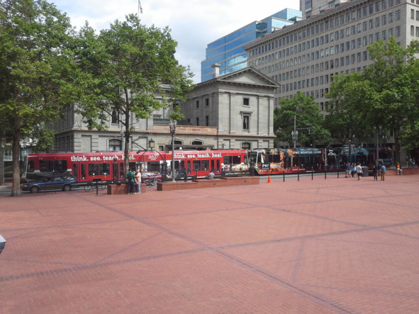 Из даун-тауна на городском трамвае мы выбираемся в центр Портленда. Главная площадь – Пионерская – Pioneer-square.