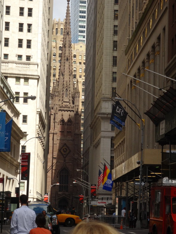 На пересечении Уолл стрит и Бродвея расположена церковь Святой троицы, говорят, что храм этот тоже хрестоматийный для Нью-Йорка. Наверное, это так. Вот в чем уж я точно не сомневаюсь, так это в его необходимости в конце улицы больших мировых денег. Они, эти большие деньги и это тоже хрестоматийный факт («Боливар не вынесет двоих») делаются всякими способами, в том числе и такими, после которых нелишним будет и помолиться, да испросить прощения у Всевышнего. На этот случай, нате вам, пожалуйста – Храм Святой троицы через дорогу. Все здесь рядом, есть место грешить, и есть где каяться. Тем более, что все маршруты на Уолл стрит ведут или к проливу, для отчаявшихся, или к храму за помощью и прощением к Богу.