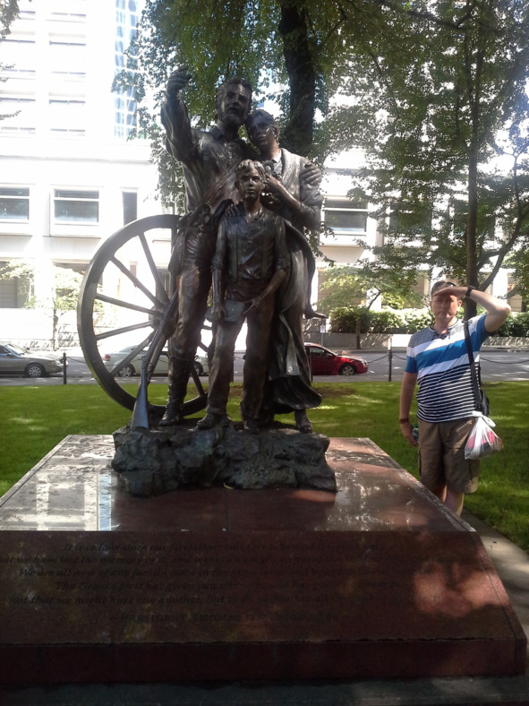 В центре Портленда есть памятник этим самым пионерам Дикого запада. Вот они – семья мормонов всматривается в светлое будущее. Позади колесо телеги, в руках Библия, рядом ружье. Без него на Диком западе никуда. А вдруг дикие звери или краснокожие? Одним словом, нужная, да даже, незаменимая вещь для пионера. А в глазах надежда и тревога: как-то оно будет?
