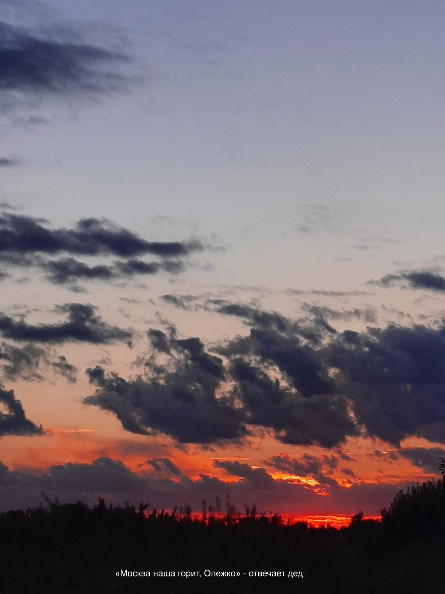 Третий день путешествия подходил к концу, когда небо осветилось заревом. «Дедко, что это?» – спросил Олежка, показывая на зарево. Остановил дед лошадку, повернулся к зареву. Истово стал креститься: «Сашенька, я сберегу твоего мальчика, не оставь своего Сережу. Ему очень нужна помощь, а за сыночка не беспокойся, сохраню его», – дед Иван считал Сашеньку святой еще и когда жива была, а уж после смерти и не сомневался, потому и просил о помощи для Сережи. «Москва наша горит, Олежко» – отвечает дед. «Дедко, а где тятя? Он татар бьет?» – опять спросил Олежка. «Ох, бяда, Олежко, бяда, сиротинка!» – только и сказал дед. А скоро они въехали на большую поляну.