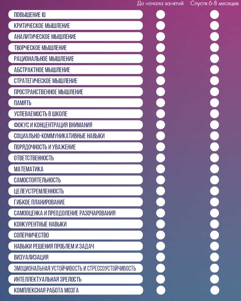 Перед тем, как начать заниматься, заполните этот трекер по навыкам до первого урока и спустя 6-8 месяцев занятий. Трекер поможет Вам более осознанно подойти к занятиям по шахматам и отследить изменения в мышлении Вашего ребенка. Проставьте галочки напротив тех навыков, которыми, как Вы считаете, владеет Ваш ребенок.