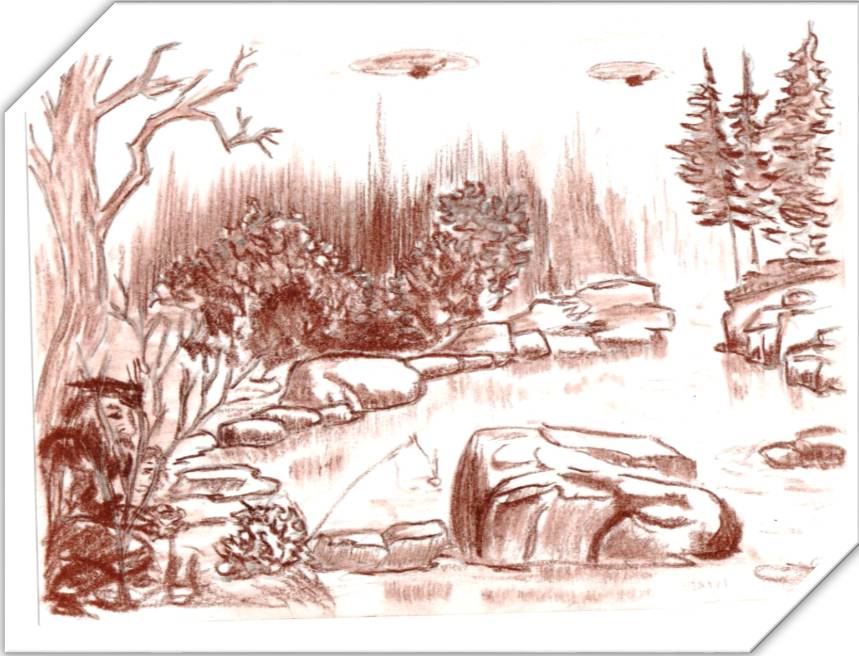 Вчера пролетели ЭТИ! Дедушка велел сразу прятаться. Какой гул от ЭТИХ! Страшно было! Разные бывают, но самые страшные, которые с тремя ногами и хвостом. Летают низко, я вижу даже, как качает верхушки деревьев. Хорошо, бывают редко. Пристал к деду с вопросами. Он сказал, что мне рано ещё! А что рано? Сказал прятаться нужно, а то поймают и сожрут. Сказал, беречься гудящих с хвостом, эти самые опасные. Те, что высоко и не гудят, те не такие. Нарисовал одного из этих, чтобы не забыть. *Неясный силуэт. Похоже на круг, под которым три отростка. Отправлено на экспертизу*.