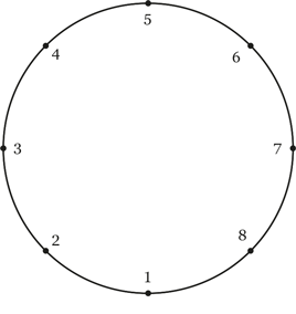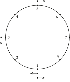 РешениеПервым делом подмечаем, что любая встречная пара сгустков, движущихся с одинаковой скоростью, будет встречаться на кольце ровно два раза в диаметрально противоположных точках. Если мы хотим задействовать таким образом восемь точек, то минимальное количество встречных пар – четыре.