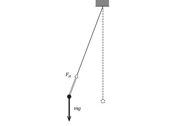 Рис. 1. Математический маятник в поле тяжести Земли. Пунктиром показано положение равновесия, сплошной линией – отклонение от него. Сила натяжения нити FН и сила тяжести mg, складываясь, порождают возвращающую силу, которая и заставляет маятник колебаться