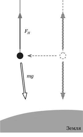 Обратите внимание, как поменялись ролями две силы! В обычной задаче (рис. 1) сила тяжести всегда направлена вниз, а сила натяжения нити в колеблющемся маятнике отклоняется от вертикали. Здесь все наоборот: направление нити, а значит, и сила ее натяжения все время остаются вертикальными, а отклоняется от вертикали уже сила тяжести. При этом, чтобы сила тяжести не изменялась по абсолютной величине, надо, чтобы угол отклонения был мал, то есть чтобы амплитуда колебания была много меньше радиуса Земли.