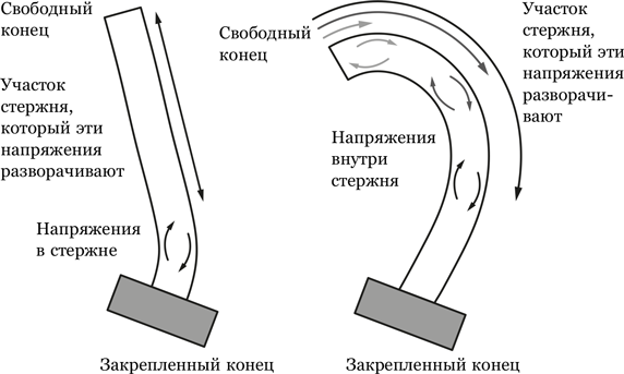 Рис. 3. Слева: упрощенный пример, в котором выпрямляющие напряжения присутствуют только в основании и разворачивают стержень фиксированной длины. Справа: реальная ситуация, при которой напряжения присутствуют сразу везде и действуют на участки стержня разной длины