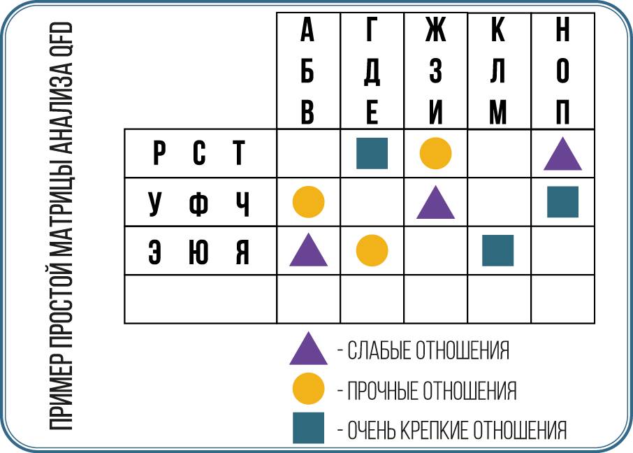 QFD – это инструмент, который помогает в разработке изделия/процесса от стадии концепции до его производства и далее. QFD особенно полезен для выявления критических требований заказчика и создания конкретных связей между этими требованиями и параметрами проекта. Метод использует матрицы для организации информации и помогает различным заинтересованным сторонам согласовать критические параметры и компромиссы. На рисунке в данном блоке показан типичный пример простой матрицы. Степень его использования будет зависеть от размера и сложности продукта/процесса. Это метод, который требует времени для освоения, но при правильном применении может принести существенные преимущества с точки зрения доли рынка, более конкурентоспособного продукта/процесса и обеспечения внесения изменений в конструкцию до начала производства или его изготовления, а не после.