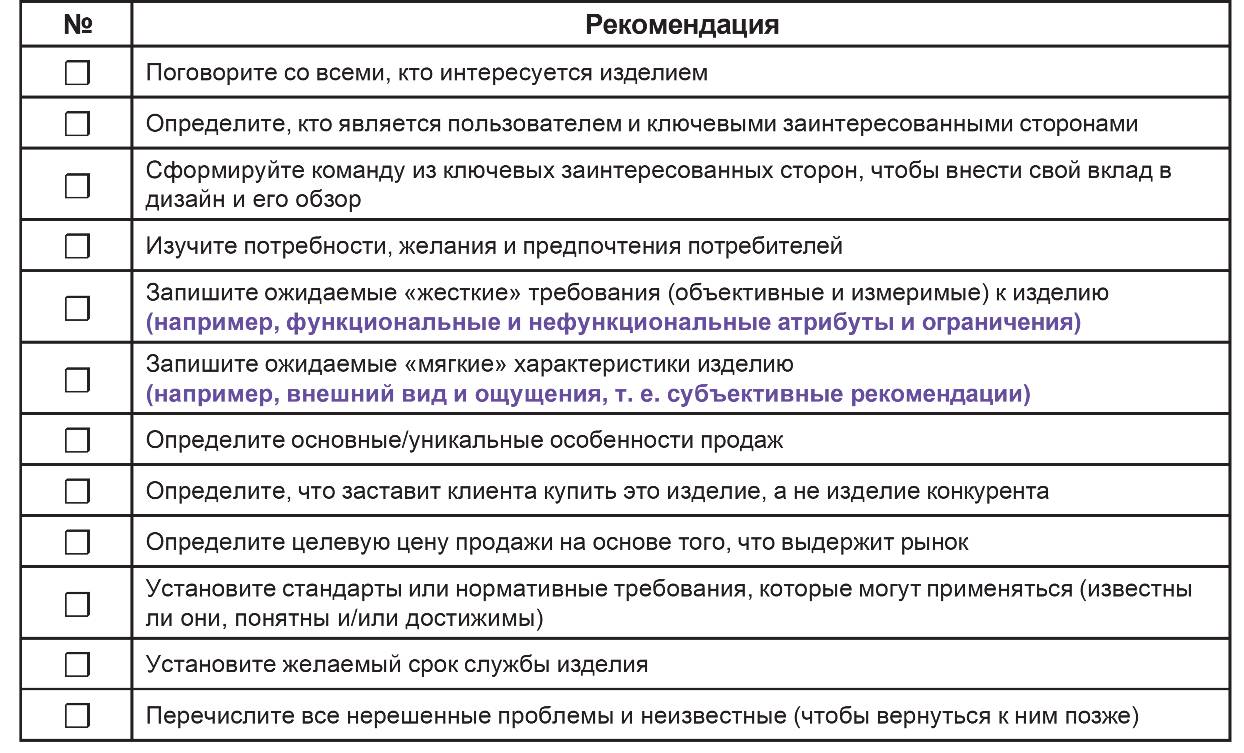После идентификации пользователей необходимо получить информацию об их требованиях. Критерии, которые уже установлены или будут установлены, должны включать те, которые сделают изделие успешным. Скорее всего, они будут выражены в общих чертах, но любые ограничения на такие параметры, как размер, вес, шум, мощность, цвет или внешний вид, должны быть включены везде, где это возможно. Следует подчеркнуть характеристики изделия, которые дают рыночное преимущество перед конкурентами.