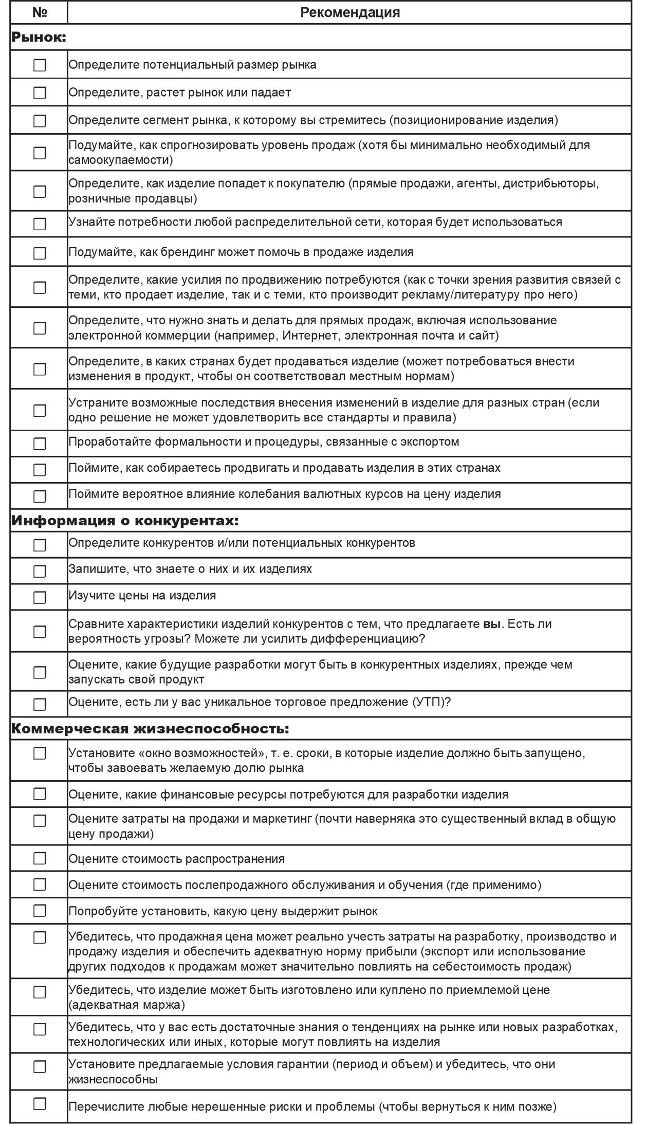 В таблице 6.2 приведен список рекомендаций при определении рынка, информации о конкурентах и коммерческой жизнеспособности.