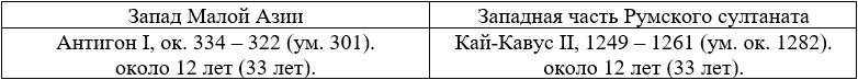 По персидской хронологии 334/333 г. до н.э. соответствует 1249/1250 г. Таким образом, аналогия правлению Антигона на этих территориях выглядит так: «В 1246 г. внезапно скончался султан Гияседдин Кейхусрев I. Новым султаном стал старший сын Иззеддин Кейкавус, которому было всего 11 лет. В 1246 г. в столице монгольского государства г. Каракорум был созван курултай для избрания нового Великого хана. Курултай избрал новым Великим ханом Гуюка (1246 – 1248). Иззедцина Кейкавуса Гуюк низложил. Султаном сельджукского государства он назначил Рукнеддина Кылыч Арслана. В 1249 г. Рукнеддин Кылыч Арслан в сопровождении 2 тысяч монгольских всадников прибыл в Сивас. Власть нового султана признали в Эрзинджане, Сивасе, Кайсери, Малатье, Харпуте и Диярбакыре. Остальная часть страны, по-прежнему, подчинялась Иззеддину Кейкавусу» [39]