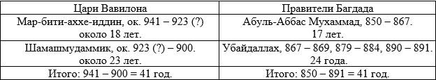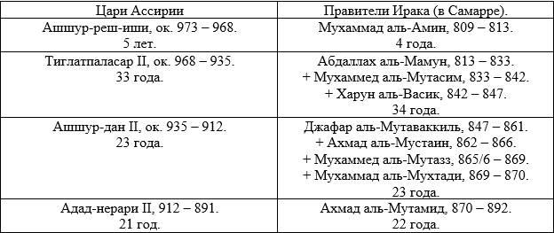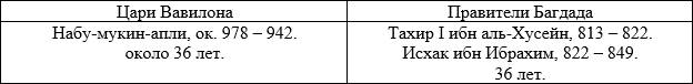 Описывая в предыдущей главе историю Ассирийского царства, мы столкнулись с тем, что вавилонские цари этого периода, по-видимому, соответствуют правителям (губернаторам) Багдада. Известно, что с 762 года Багдад был столицей Аббасидов, однако халиф аль-Мутасим (833–842) перенес столицу в Самарру, а Багдад передал под управление Тахиридов: «Династия Тахиридов правила Хорасаном с 821 по 873 год. Помимо управления Хорасаном, Тахириды также служили военными губернаторами (ашаб аш-шурта) Багдада, начиная с назначения Тахира на эту должность в 820 году. После того как он уехал в Хорасан, губернаторство в Багдаде было передано Исхаку ибн Ибрагиму, который управлял городом более двадцати пяти лет. На время его губернаторства приходиться отъезд халифов из Багдада, когда они сделали недавно построенный город Самарру своей новой столицей. Когда Исхак умер в 849 году, ему наследовали сначала двое его сыновей, а затем в 851 году внук Тахира Мухаммад ибн Абдаллах. Он сыграл важную роль в событиях «Анархии в Самарре» в 860-х годах, предоставив убежище халифу аль-Мустаину и командуя обороной Багдада, когда он был осажден силами соперничающего халифа аль-Мутазза в 865 году. Его преемниками стали его братья, сначала Убайдалла, а затем Сулейман, которые продолжали исполнять обязанности губернатора города еще два десятилетия. Однако в 891 году Бадр аль-Мутадиди был назначен ответственным за безопасность Багдада вместо Тахиридов, и после этого семья потеряла свое влияние в халифате» (en.wikipedia.org/wiki/Tahirid_dynasty).