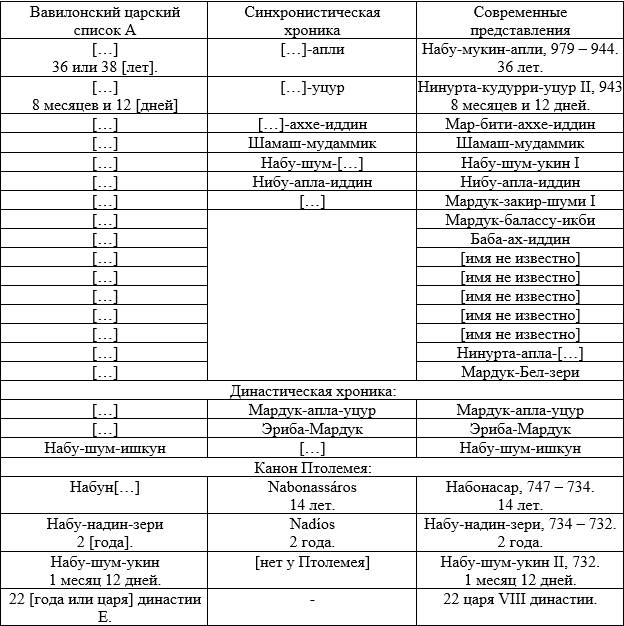 Исходя их этого соответствия, мы можем предположить, что начало правления первого представителя VIII династии (Набу-мукин-апли) может быть датировано примерно 850 – (979–941) = 812 годом. Однако стоит заметить, что дата начала правления Набу-мукин-апли в различных источниках варьируется между 980 и 977 гг. до н. э., т. е. в нашем случае временем между 811 и 814 гг.