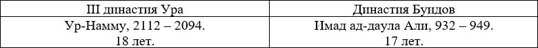 – Если исходить из нашего предположения об идентичности III династии Ура и династии Буидов, напрашивается вывод о том, что первый представитель III династии Ура Ур-Намму должен соответствовать первому представителю династии Буидов. О приходе к власти Буидов известно следующее: «Абу-Шуджа Буйа вместе с сыновьями Али, Хасаном и Ахмадом поступил наемником в армию табаристанского эмира Макана, где Буиды близко сошлись с двумя братьями-гилянцами – Мардавиджем и Вушмагиром, сыновьями Зийара. Макан вскоре был убит. Вместо него эмиром стал Мардавидж. К 932 г. он составил значительное государство, которое, кроме Гургана, Табаристана и Дейлема, заключало в себе Джибал до Хамадана, Хульван и Исфахан. Под началом Мардавиджа братья-Буиды сделали быструю военную карьеру, стали полководцами и наместниками Зийаридов в Ширазе. Собственные завоевания Буидов начались с того, что Али отнял у халифа ал-Кахира Исфахан (по [72] в 932 году). В 934 году Буидам покорился Шираз. После смерти Мардавиджа в 935 году Хасан отнял у Вушмагира Джибал от Исфахана до Казвина. В 943 г. он завладел Реем. Тем временем Али захватил весь Фарс, а Ахмад – Кирман и Хузистан. 11 декабря 945 г. он вступил в Багдад и заставил аббасидского халифа признать свою власть» [58].