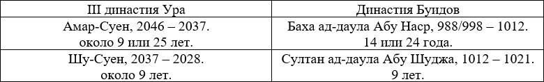 Возможная аналогия: «Шараф-ал-даула тотчас после смерти Адуд-ал-даулы (в марте 983) выступил из Кирмана, взял Шираз и двинулся к Багдаду, чтоб отнять его у своего брата. Возгорелась война, но в Сафаре 376 (июнь-июль 986) состоялось между братьями соглашение, в силу которого Багдад и его округ остались за Самсам-ал-даулой, но на монетах и в молитвах его имя должно было поминаться лишь после имени Шараф-ал-даулы» [27].