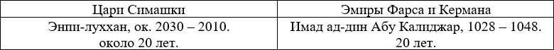 Так как Элам (Аншан) соответствует Фарсу, то аналогия в следующих событиях: «В январе 1024 года умер Султан ад-даула (правитель Фарса), после чего его сын Абу Калиджар и его дядя Абу-ль-Фаварис в течение двух лет боролись за контроль над Фарсом и Хузестаном (Сузианой). Абу Калиджар одержал победу, но Абу-ль-Фаварис сохранил за собой Кирман» (ca.wikipedia.org/wiki/Jalal-ad-Dawla).