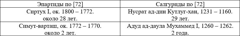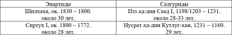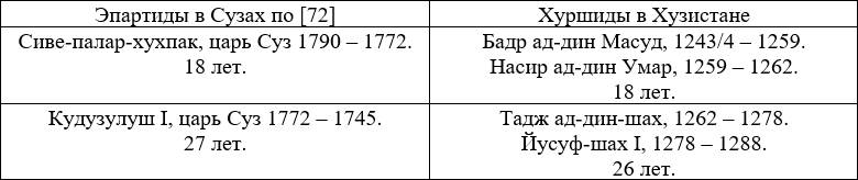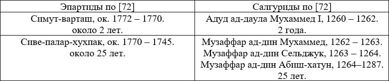 Как мы предположили выше, Симутварташ соответствует МЛАДШЕМУ БРАТУ Кутлуг-хана, Мухаммаду (1260 – 1262). Их ПЛЕМЯННИКИ, братья Сивепалархухпак и Кудузулуш I, могут соответствовать братьям Мухаммад-шаху (1262 – 1263) и Сельджук-шаху (1263 – 1264) – сыновьям Салгура ибн Сада.