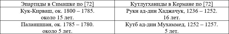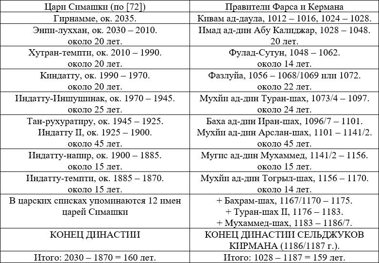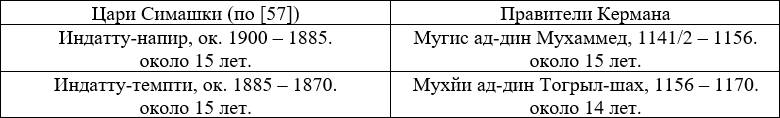 – По [72] Суккалем Элама и Симашки в правление Сиртуха I были Кук-Кирваш (ок. 1800 – 1785) и Палаишшан (ок. 1780). Исходя из предположения о соответствии Симашки средневековому Керману, соответствие может выглядеть так: