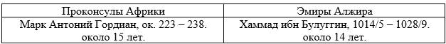 Считается, что в это время территорию, соответствующую территории римской провинции Африка, контролировали представители династии Зиридов (в западной части правила ветвь Зиридов – Хаммадиды). Поэтому «мятеж Гордиана» против императора Максимина может соответствовать войне Константина VIII с Зиридами (Хаммадидами): «В апреле 1025 г. снаряжена была экспедиция в Сицилию под предводительством евнуха Ореста, который должен был вместе с катепаном Боиояном внести войну на остров Сицилию. Когда Орест потерпел в Сицилии поражение, правительство Константина VIII отозвало его, равно как и катепана Боиояна» [97]. «В 1025 г. катепан Воиоанн и Орест высадились на Сицилии, ожидая прибытия императора с подкреплениями. Видимо, византийские приготовления были столь масштабны, что Калбиты обратились за помощью к эмирату Зиридов. Африканские арабы, объявив грекам джихад, в январе 1026 г. отправили на Сицилию 400 кораблей с войсками и добровольцами. Эскадра попала в сильный шторм у о. Пантелдария: многие суда погибли, лишь некоторые смогли вернуться в Африку. Позже сицилийские арабы все же получили помощь от Зиридов и мусульмане перешли в наступление не только на Сицилии, но и в Калабрии. К 1029 г. они захватили несколько прибрежных укреплений и превратили их в опорные пункты для своей сухопутной армии и флота. Лишенные поддержки из Константинополя, Василий Воиоанн и Орест потерпели поражение и вынуждены были эвакуировать свои отряды с острова на материк» (adsv-28-03).