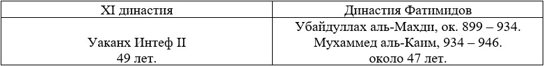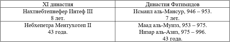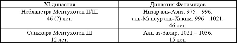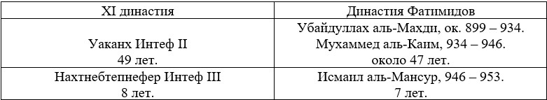 – Туринский папирус приписывает Небхепетра 51 год правления. Среди Фатимидов, к которыми мы отождествили представителей XI династии, нет халифа с подобной продолжительностью правления. Возможно, в написании или переводе этого места Туринского папируса допущена ошибка, например такая: