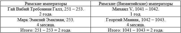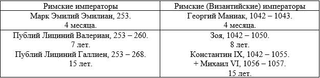 Четыре месяца правления Эмилиана может соответствовать четырем месяцам правления Маниака (октябрь 1042 г. – начало 1043 г.). В этом случае соответствие для римских императоров может выглядеть так: