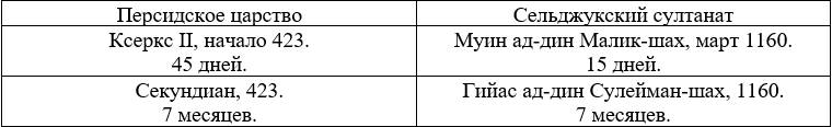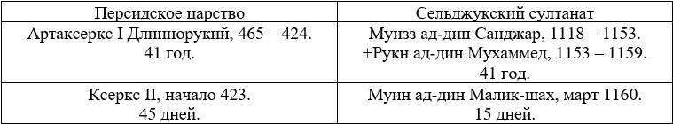 Смерть Артаксеркса I в декабре 424 г. до н.э. (в КОНЦЕ ДЕКАБРЯ 1159 г.) может соответствовать следующим событиям: «Султан Мухаммад умер от туберкулеза в зу-л-када или зу-л-хиджжа 554 г. х. (в ДЕКАБРЕ 1159 г.)» [69]. «Мухаммад готовился к новому походу на Багдад, но вскоре заболел и в КОНЦЕ ДЕКАБРЯ 1159 г. умер» [68].