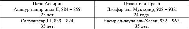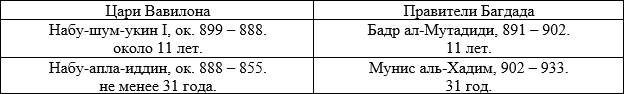 Выше мы предположили, что цари Вавилона соответствуют правителям Багдада. Продолжительность правления Набу-апла-иддина не известна. По [90] его правление продолжалось до 860 года до н. э. В одной из хроник зафиксирован 31-й год правления Набу-апла-иддина. Исходя из предполагаемой продолжительности его правления, соответствие может выглядеть так: