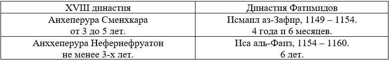 Аналогия: «Ал-Фаиз, наследовал своему отцу, аз-Зафиру (1149 – 1154), в возрасте 5 лет. Когда через пять лет, в 1160 году, он бездетным отошел в мир иной, фатимидский визир посадил на трон другого ВНУКА ал-Хафиза с титулом ал-Адид. В то время ал-Адиду исполнилось ДЕВЯТЬ лет» [14].