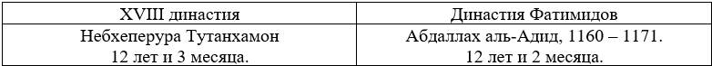 Таким образом, Тунанхамон, ставший фараоном в 9 лет, должен соответствовать аль-Адиду, провозглашенному халифом в 9 лет.