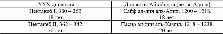 Аналогия в следующих событиях: «Осенью 1235 года египетская армия, к которой присоединились отряды из Хомса и Хамы, переправилась через Евфрат. Первой целью стала Эдесса. После падения города аль-Камиль разрушил городскую цитадель и двинулся на Харран. После захвата Харрана, аль-Камиль повернул армию против атабека Мардина, который помогал румскому султану в предыдущем году. Однако после первых столкновений с мардинскими силами, аль-Камил получил сообщение из Мосула о новом монгольском вторжении в Джазиру. На этот раз монголы проникли до окрестностей Синджара. Аль-Камиль во избежание столкновений с монголами отвел войска за Евфрат. Он провел остаток года в Дамаске, а весной следующего года вернулся в Египет» [3]. «Разгневанный Кей-Кубад I решил совершить новый поход против Аййубидов. Он подготовил войска к выступлению, однако 4 шаввала 634 г. х. (4 мая 1237 г.) султан Ала ад-Дин Кей-Кубад I был отравлен… Узнав об этом, многие хорезмийские эмиры, боясь, что их постигнет та же участь, оставили свои владения и наделы и вместе с семьями и соплеменниками ушли из Анатолии. После этого хорезмийцы поступили на службу к владетелю ал-Джазиры аййубиду ал-Малику ас-Салиху. В мухарраме 635 г. х. (сентябрь 1237 г.) умер владетель Дамаска ал-Малик ал-Ашраф, а в раджабе того же года (март 1238 г.) скончался владетель Египта, старший в роде Аййубидов ал-Малик ал-Камил, и вражда между аййубидскими принцами достигла апогея. Чувствуя за собой поддержку хорезмийцев, ал-Малик ас-Салих приступил к захвату владений, принадлежавших младшим представителям рода Аййубидов. В джумада II 636 г. х. (январь 1239 г.) ал-Малик ас-Салих захватил Дамаск, которым до этого времени владел правитель Египта ал-Малик ал-Адил. Хорезмийцы в том же, 1239 г. решили захватить Хомс, которым владел Асад ад-Дин Ширкух. Но последний уплатил хорезмийцам огромный выкуп, и хорезмийцы ушли от Хомса» [9].