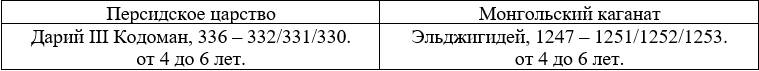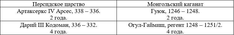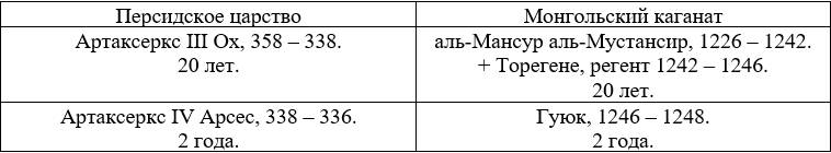 Однако по (en.wikipedia.org/wiki/Artaxerxes_III) смерть Артаксеркса III наступила в конце АВГУСТА 338 г. до н.э., т.е., по предлагаемой нами персидской хронологии, в конце АВГУСТА 1246 г. Исходя из этой даты воцарение Арсеса соответствует следующим событиям: «После смерти Угэдэя (11 декабря 1241 г.), регентство было доверено его вдове, энергичной хатун Торагане. Угэдэй завещал трон своему внуку – молодому Ширамону. Но Торагана желала, чтобы Великим ханом стал ее сын Гуйюк. Она продолжала править в качестве регентши с 1242 по 1246 г., чтобы подготовить избрание ханом Гуйюка. Курултай состоялся весной и летом 1246 года. В соответствии с желанием королевы-регентши Торганы, курултай избрал в качестве великого хана ее сына принца Гуюка, который был коронован 24 АВГУСТА 1246 года» [25].