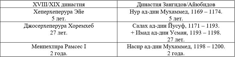 Если Хоремхеб соответствует Салах ад-дину, то 27 лет его правления могут исчисляться от 1167 г. (назначен правителем Александрии) до смерти в 1193 г. или соответствовать 1171-1198 гг. по прямому счету лет. Таким образом, соответствие может выглядеть так: