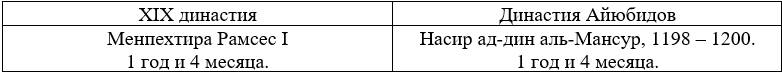 Таким образом, правление аль-Мансура, как и правление Рамсеса I, продолжалось около 1 года и четырех месяцев: 29 октября 1198 года – 17 февраля 1200 года.