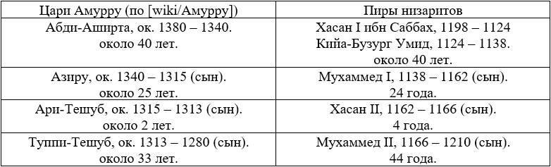 Если соотносить ОСНОВАТЕЛЯ государства Амурру с ОСНОВАТЕЛЕМ низаритского государства, то, исходя из дат, приводимых в Википедии, соответствие для царей Амурру может выглядеть так: