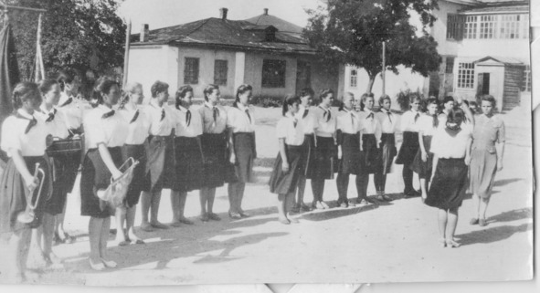 Мать, начальник лагеря ст. пионерских вожатых при базовой начальной школе, принимает рапорт. Усть-Лабинская, 1952 г.