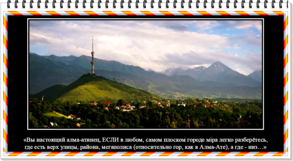 («ВЫ НАСТОЯЩИЙ АЛМА-АТИНЕЦ, если В ЛЮБОМ, САМОМ ПЛОСКОМ ГОРОДЕ МIРА ЛЕГКО РАЗБЕРЁТЕСЬ, ГДЕ ЕСТЬ ВЕРХ УЛИЦЫ, РАЙОНА, МЕГАПОЛИСА (относительно гор, как в Алма-Ате), А ГДЕ – НИЗ…» Из «Кодекса поведения алма-атинцев». )