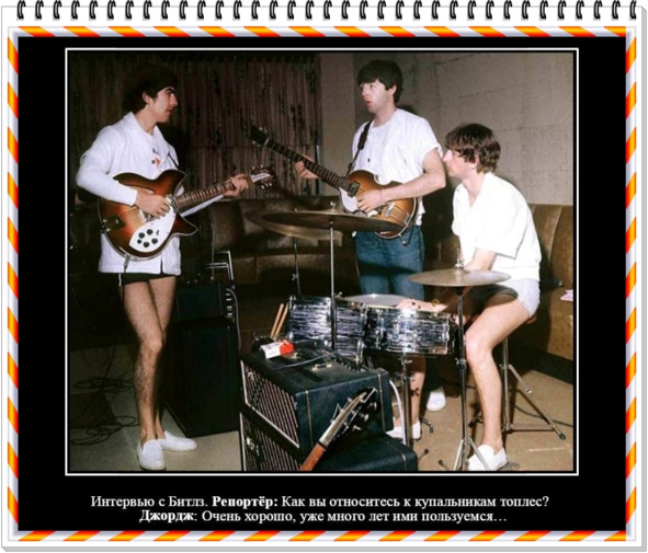 (Интервью с Битлз. Репортёр: КАК ВЫ ОТНОСИТЕСЬ К КУПАЛЬНИКАМ ТОПЛЕС? Джордж: Очень хорошо, УЖЕ МНОГО ЛЕТ ИМИ ПОЛЬЗУЕМСЯ…)