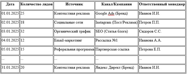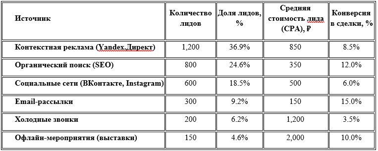 За январь 2025 года было привлечено 3,250 лидов из различных источников. Наиболее эффективными каналами стали контекстная реклама (Yandex.Директ) и органический поиск. Менее эффективными оказались холодные звонки и офлайн-мероприятия.