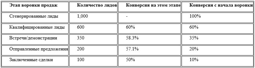 Метрики: Количество лидов на каждой стадии, проценты перехода с одного этапа на следующий.